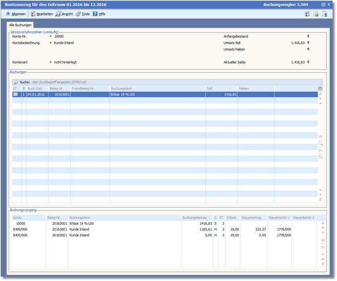 Das Programm öffnet den Kontoauszug für das Sach- bzw. Personenkonto.
