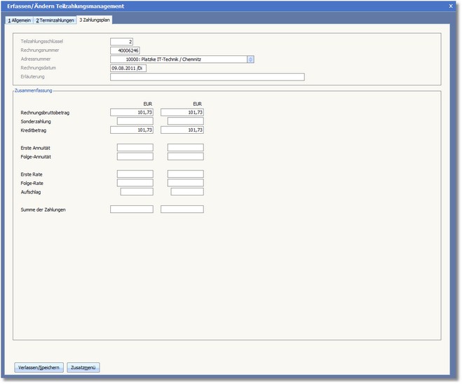 << Hier KLicken um eine Inhaltsübersicht anzuzeigen >> Navigation: Finanzbuchhaltung > Stammdaten > Basisdaten > Teilzahlungsmanagement > Arbeiten mit Teilzahlungen > Teilzahlungen vereinbaren > Die Karteikarte "Zahlungsplan" |