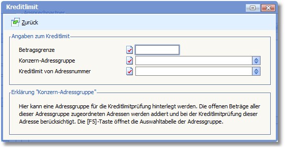 Tragen Sie hier eine Adressnummer ein, aus der bei der Kreditlimitprüfung das Kreditlimit geladen wird. Die [F5]-Taste öffnet die Auswahltabelle der Adressen.