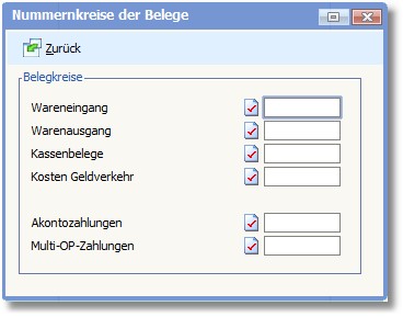 Über den Menüpunkt "Bearbeiten > Nummernkreise der Belege" in den Basisdaten legen Sie die aktuell verwendeten Belegnummern für Wareneingangsbelege, Warenausgangsbelege, Kassenbelege, Kosten Geldverkehr, Akontozahlungen und Multi-OP-Zahlungen fest. Diese werden bei entsprechenden Buchungen in diesem Bereich automatisch hochgezählt bzw. für den ersten Buchungssatz vorgeschlagen. Übernahmen von Warenein- und -ausgangsrechnungen sowie Kassenbelegen aus der Warenwirtschaft bleiben von dieser Automatik unberührt.
