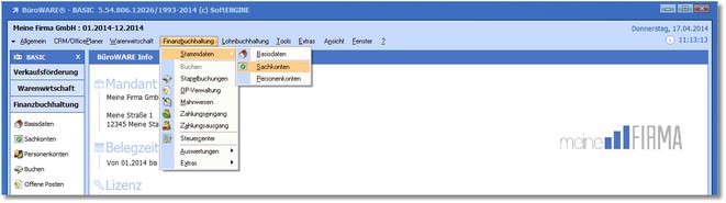 1.Klicken Sie mit der Maus im Hauptmenü auf "Finanzbuchhaltung > Stammdaten > Sachkonten".