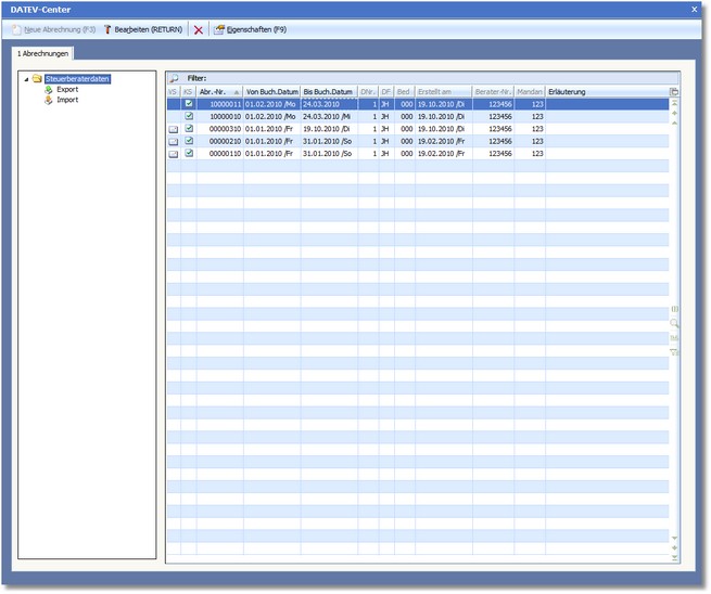 Je nach aktiver Markierung können Sie mit [F3] eine neue Abrechnung für den Import oder den Export erstellen.