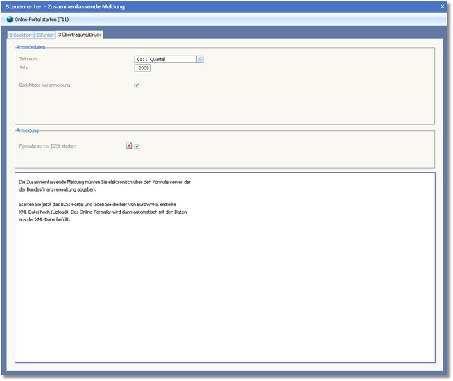 Das Programm erstellt nun die zusammenfassende Meldung für den gewünschten Zeitraum und wechselt in die Karteikarte "Übertragung/Druck".