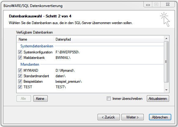 3. Klicken Sie auf <Weiter>, um die Datenbanken in die SQL Datenbanken zu übernehmen.