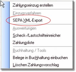 Durch Klick mit der rechten Maustaste können Sie auch den SEPA XML-Export starten.