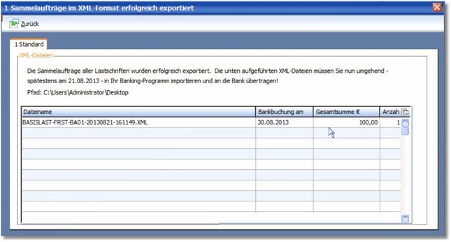 Nach Durchführung des Exports erhalten Sie nochmals eine Übersicht der Datei mit den entsprechenden Beträgen und der Pfadangabe, wo die Datei gespeichert wurde.