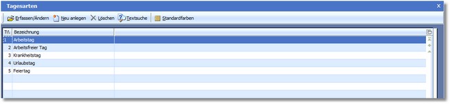 Das Programm öffnet die vorgelagerte Auswahltabelle der Tagesarten.