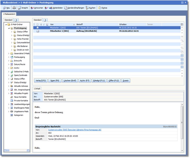 Der Mailassistent bietet die Möglichkeit, E-Mails über einen Internetzugang zu empfangen und an verschiedene Arbeitsplätze zu verteilen. Von den Arbeitsplätzen können E-Mails untereinander oder über den einen Internetzugang versendet werden.