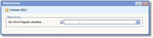 Vorsteuer, die im abgelaufenen Geschäftsjahr auf das Konto "Vorsteuer im Folgejahr abziehbar" umgebucht wurde, kann im aktuellen Geschäftsjahr auf das Vorsteuerkonto umgebucht werden. Das Konto "Vorsteuer im Folgejahr abziehbar" wird somit "aufgelöst". Voraussetzung für die Auflösung ist ein Saldenvortrag dieses Kontos. Tragen Sie hier das zutreffende Sachkonto ein.