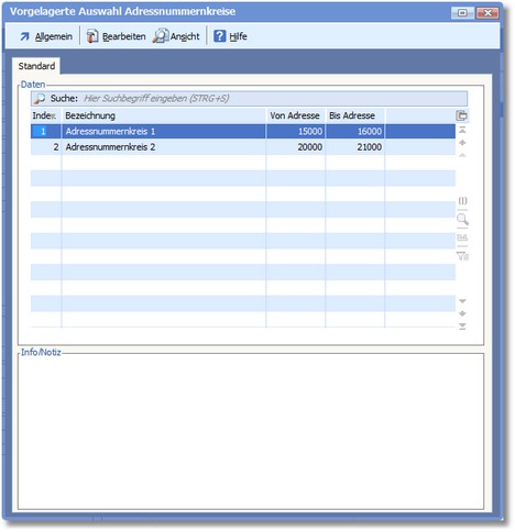 Die vorgelagerte Auswahltabelle der Adressnummernkreise wird geöffnet.