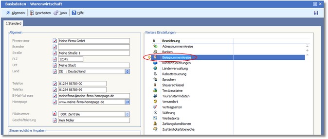 Durch Aktivierung der jeweiligen Karteikarten können Sie die Nummernkreise der Belegarten und Beleggruppen bearbeiten.