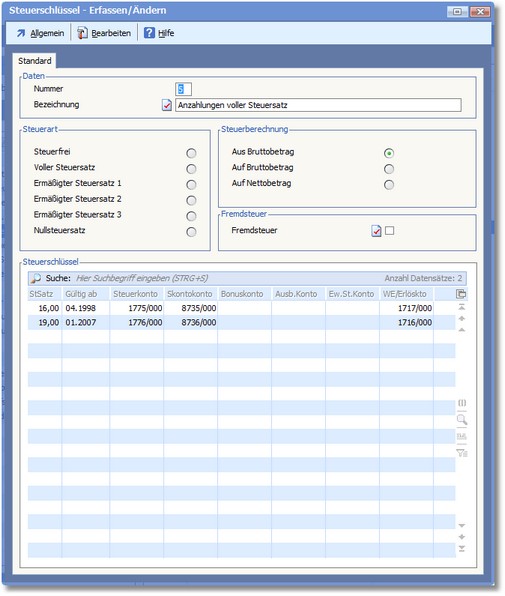 << Hier KLicken um eine Inhaltsübersicht anzuzeigen >> Navigation: Finanzbuchhaltung > Stammdaten > Basisdaten > Steuerschlüssel > Steuerschlüssel erfassen/ändern |