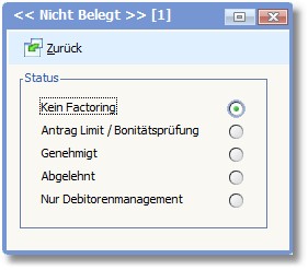 Hier wird der Factoringstatus festgelegt. Durch Aktivierung des entsprechenden Radiobuttons können Sie den entsprechenden Status der Adresse auswählen.