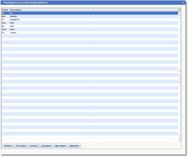 Die vorgelagerte Auswahltabelle der Mengeneinheiten wird geöffnet.