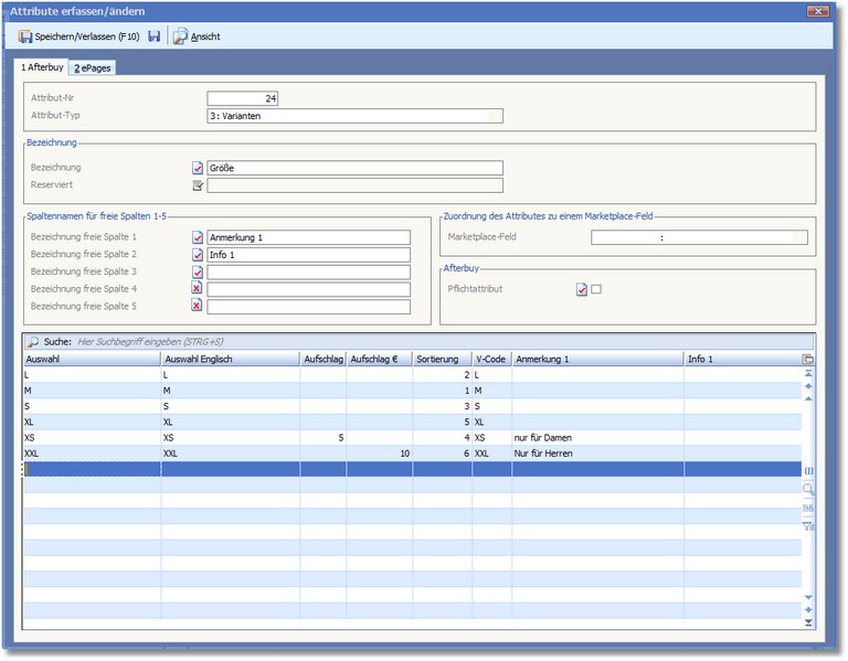 Das Variantenattribut wird zur Erzeugung neuer Varianten aus einem Artikel benötigt und ist dem Auswahllistenattribut sehr ähnlich, nur dass hier in weiterer Folge für jede mögliche Variante ein neuer Artikel mit Lagerführung und eigenem Preis angelegt wird. Dazu enthält die Tabelle zusätzlich die Spalte V-CODE (Variantencode).