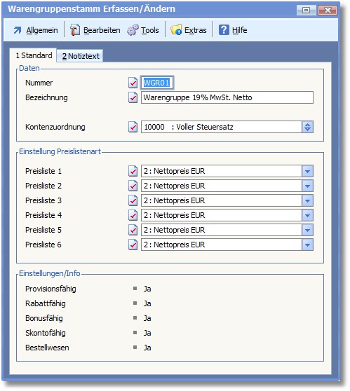 Geben Sie hier die Warengruppennummer an. Dieser 5-stellige Schlüssel bildet das Such- und Ordnungskriterium der Warengruppen.