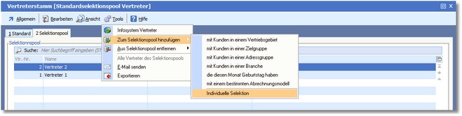 << Hier KLicken um eine Inhaltsübersicht anzuzeigen >> Navigation: Warenwirtschaft > Stammdaten > Vertreter > Selektionspool Vertreterstamm > Individuelle Selektion |