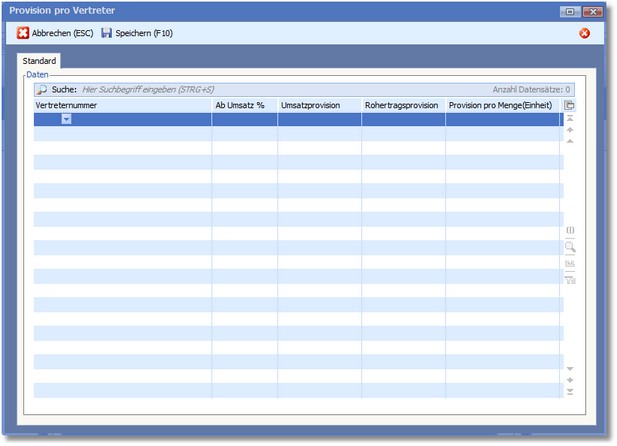 Hier können in einer Tabelle Umsatz-, Rohertrags- oder Mengenprovisionen für die einzelnen Vertreter festgelegt werden.