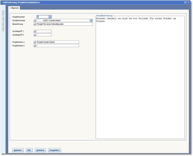 Jedes Projekt wird durch einen eindeutigen Schlüssel innerhalb der Warenwirtschaft identifiziert. Der Schlüssel kann zwischen 1 und 99999999 frei vergeben werden. Die Projektnummer bildet das Such- und Ordnungskriterium der Projektdaten.