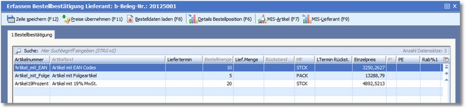 Weicht der Preis vom Einzelpreis der Bestellung ab, können Sie mit [F11] die bestätigten Preise in die Bestellung übernehmen.