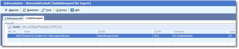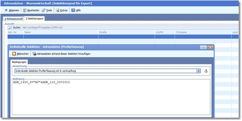 Es soll eine Selektion aufgebaut werden, welche nur Adressen in den Selektionspool holt, in denen das Land = Österreich und die Postleitzahl = 1010 (1. Bezirk) ist, z.B.: