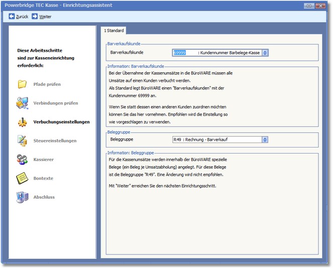 << Hier KLicken um eine Inhaltsübersicht anzuzeigen >> Navigation: BüroWARE Powerbridge > TEC-Kassenschnittstelle > BüroWARE-Schnittstelle einrichten > Verbuchungseinstellungen |