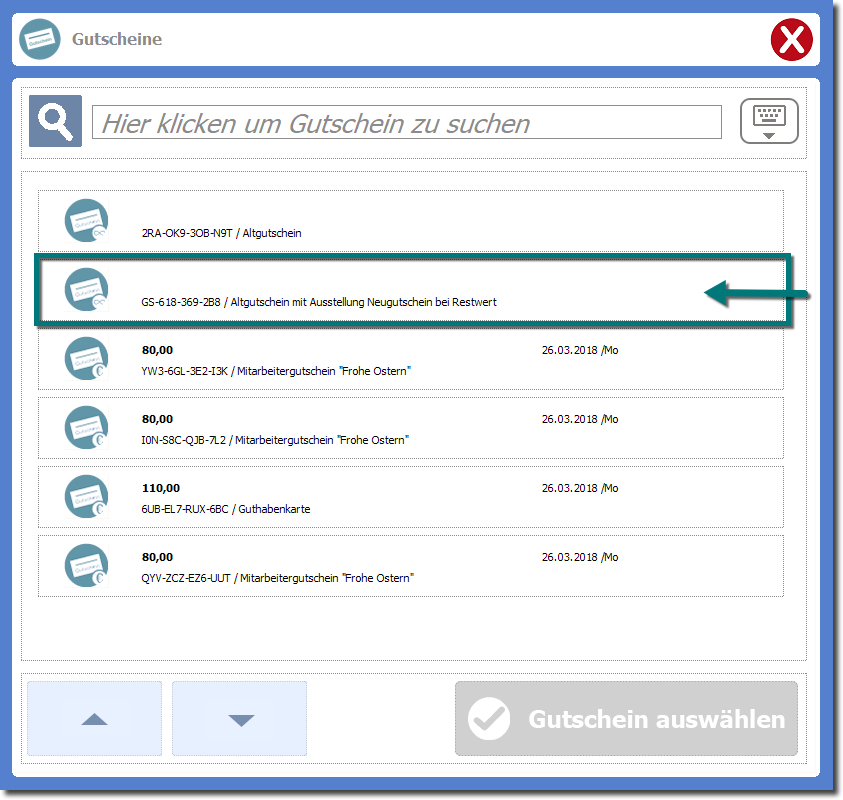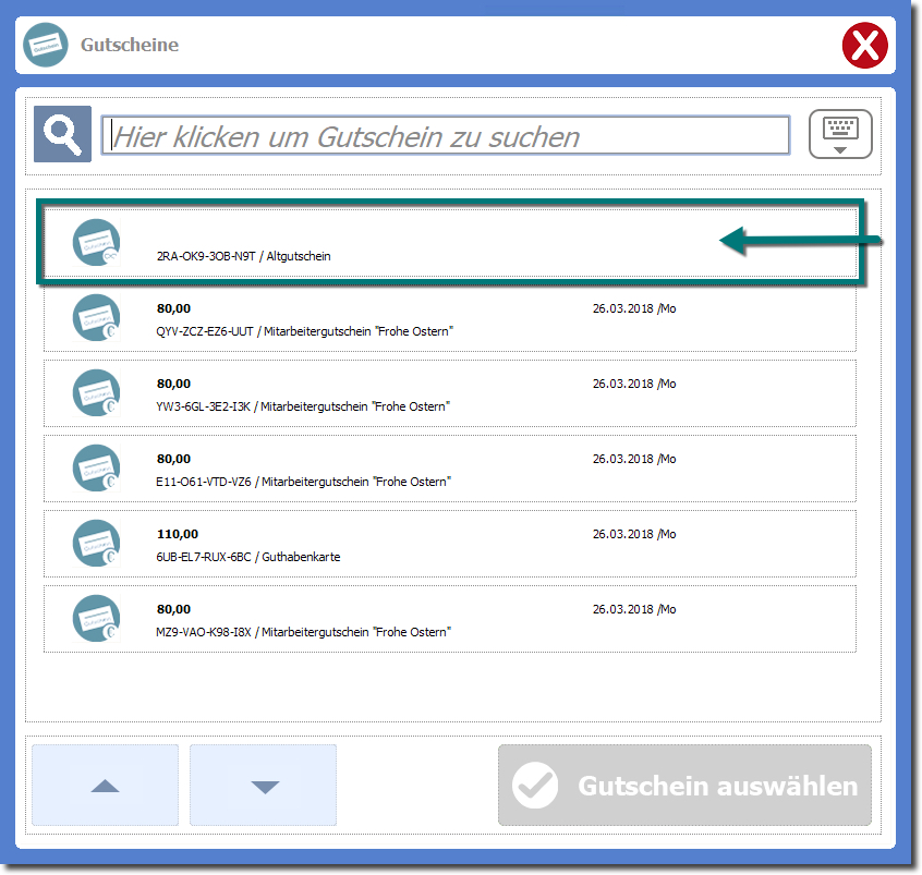 Im Beispiel wird der Gutschein als erstes in der Liste angezeigt und muss nicht gesucht werden.