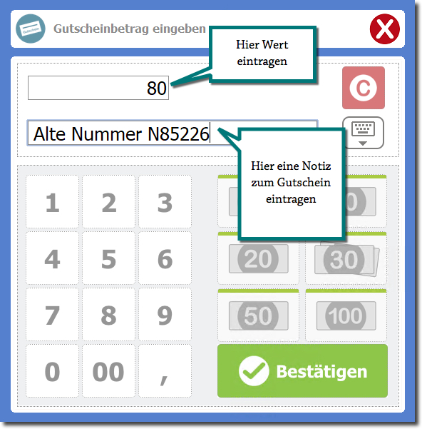 Tragen Sie den Gutscheinwert und die Notiz ein.
