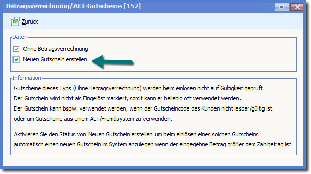 Eine zusätzliche Option ist es, einen Gutschein anzulegen, der im Falle eines Restwertes einen neuen Gutschein ausstellt.