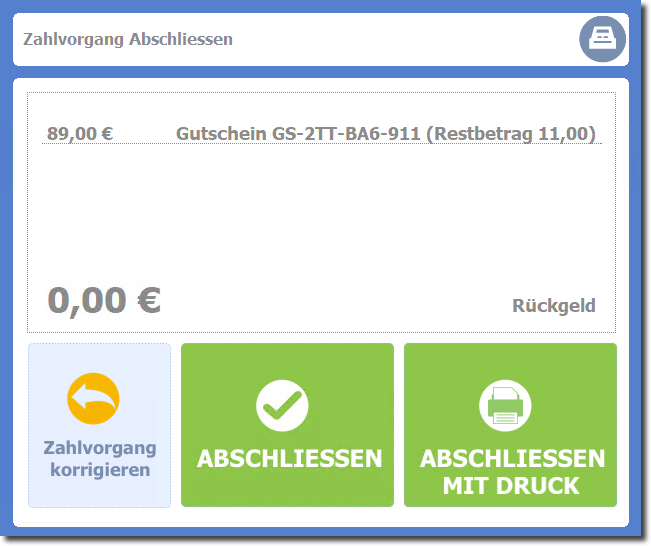 Der Zahlvorgang wird beendet und der Gutschein über den Restbetrag ausgedruckt.