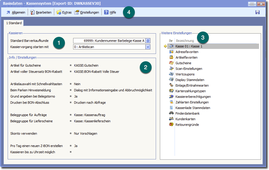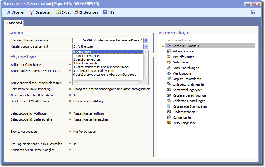 << Hier KLicken um eine Inhaltsübersicht anzuzeigen >> Navigation: Kassensystem > Technische Informationen (Systeminformation) > Vorbereitende Arbeiten > Grundeinrichtung der Kasse > Detaileinrichtung der Kasse (Basisdaten) |