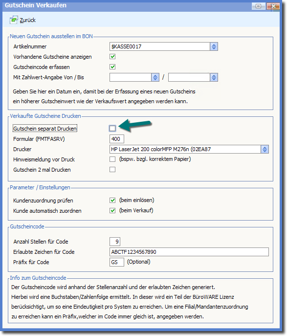 Hier kann die Option "Gutschein separat drucken" deaktiviert werden.