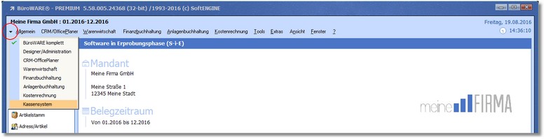 1. Zeigen Sie im Hauptbildschirm der BüroWARE auf den Pfeil links in der Menüleiste