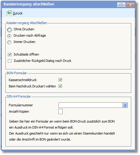In diesem Bereich können Sie durch Aktivierung des entsprechenden Radiobuttons festlegen, wie ein Kassiervorgang abgeschlossen werden soll: