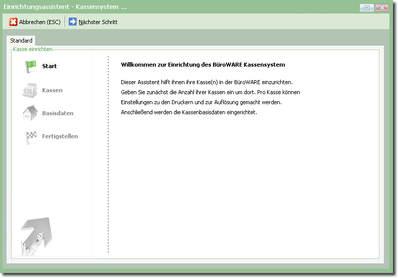 Dieser Assistent führt Sie durch die Kasseneinrichtung und legt ggf. "im Hintergrund" nötige Daten an.