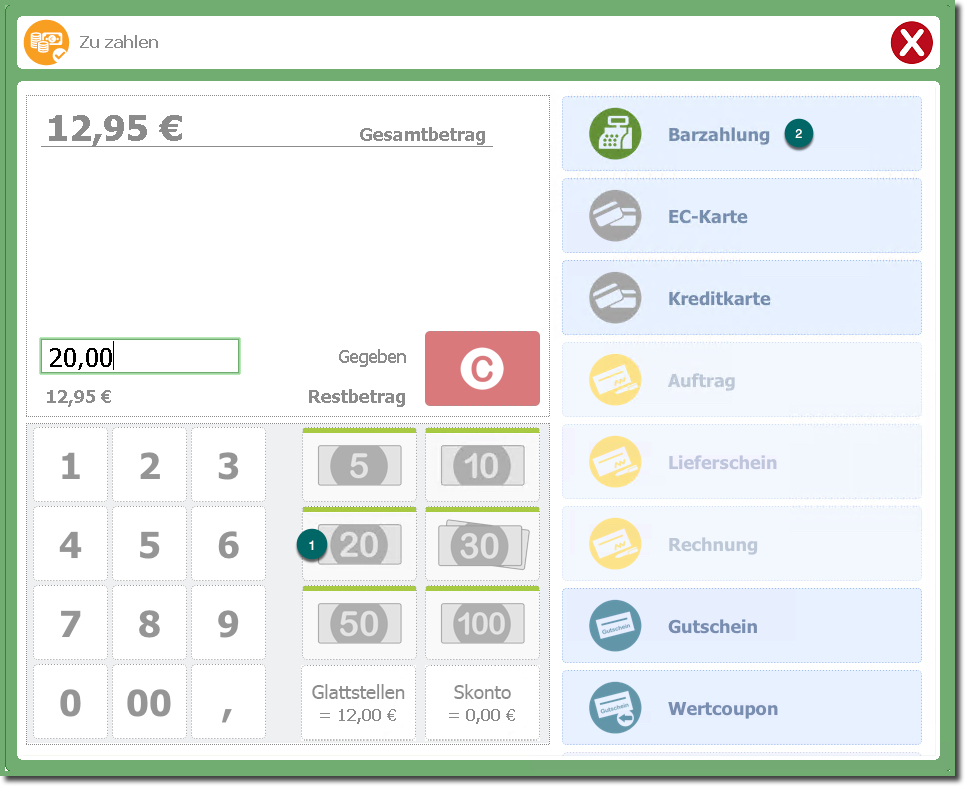 Tragen Sie das gegebene Bargeld mithilfe der Tastatur oder des Zahlenfeldes auf einem Touchscreen ein oder nutzen Sie die "Geldscheinschnellwahltasten" ➊ um gleich einen der vorgegebenen Geldscheine auszuwählen.