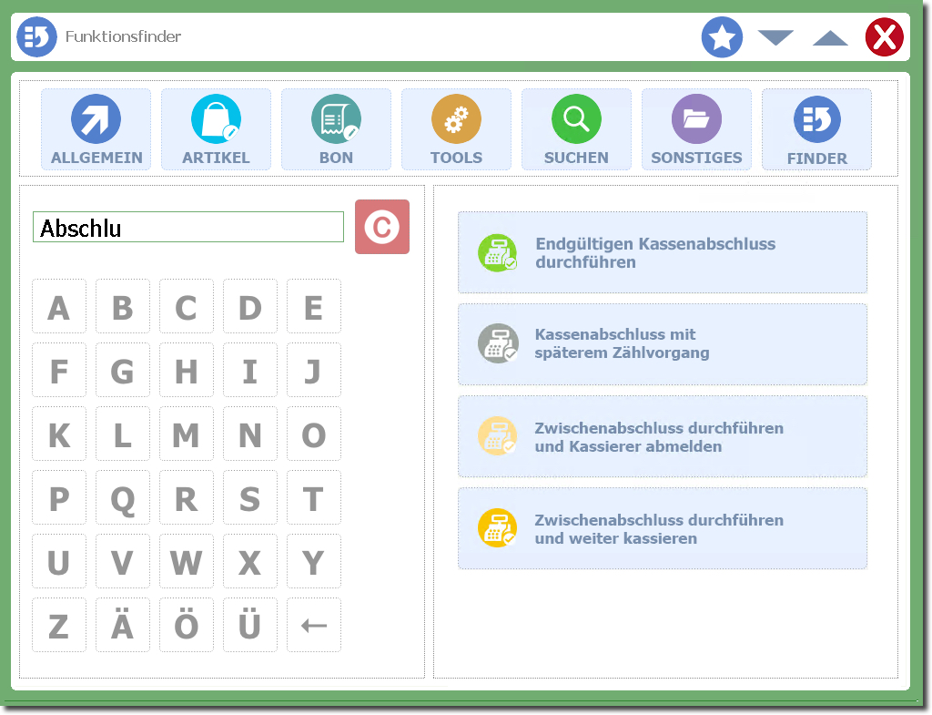 Der "Finder" schlägt passende Funktionen vor, die Sie direkt von dort aus aufrufen können - wie beispielsweise den BON-Nachdruck.