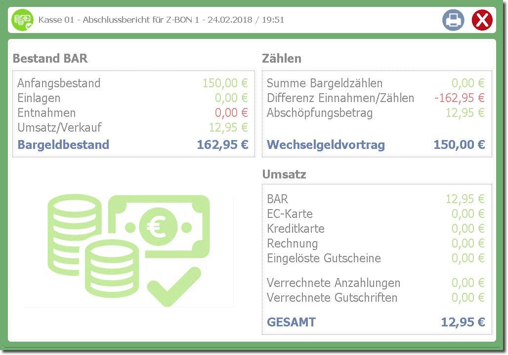 Der Abschluss wird durchgeführt und der "Z-BON" gedruckt.