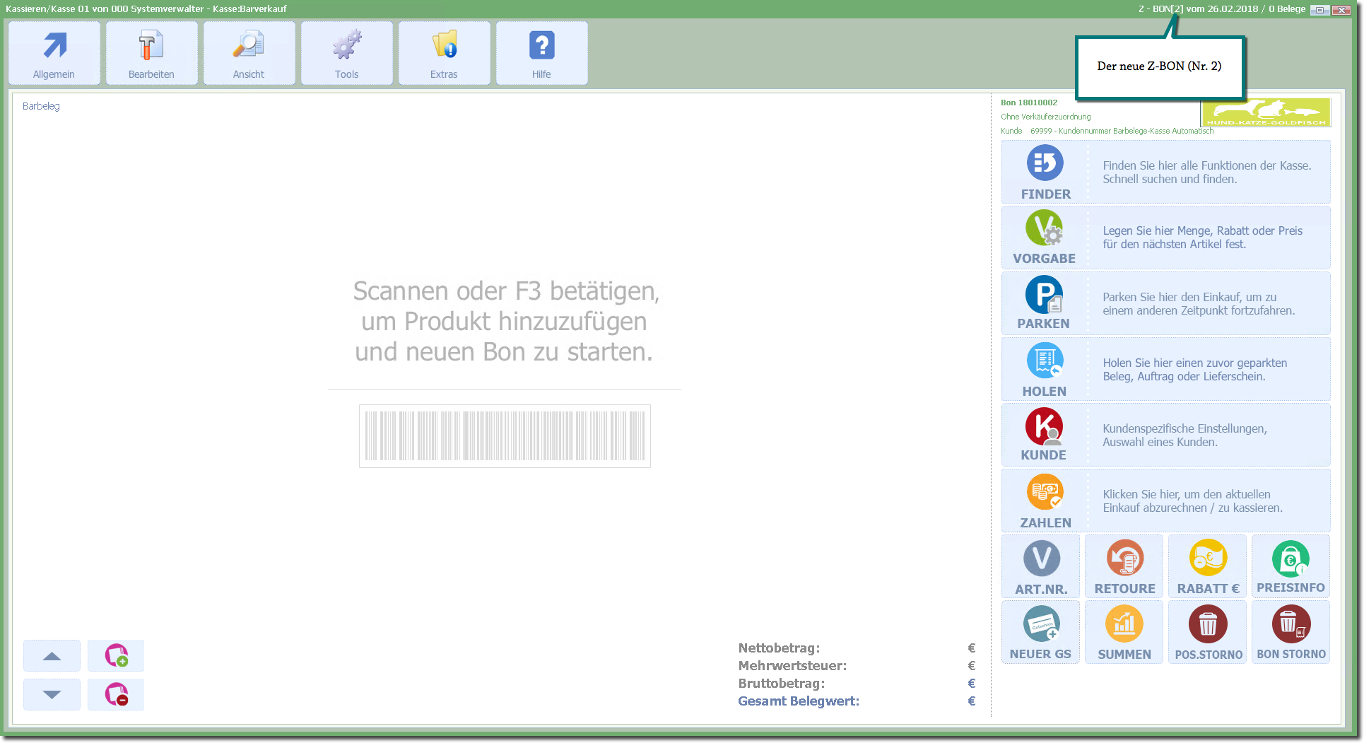 Die Erfassungsmaske für einen neuen BON wird angezeigt und es können Verkaufsvorgänge durchgeführt werden.