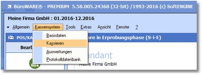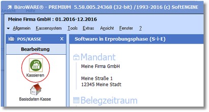 1. Klicken Sie mit der Maus im Hauptmenü der SoftENGINE Kasse auf "Kassensystem > Kassieren"