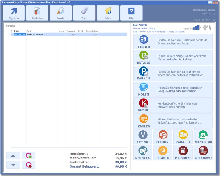 BüroWARE wechselt nun zum Dialog "Kassieren".