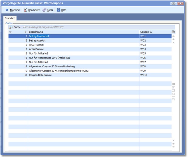 Duplizieren Mit [F8] können Sie eine Kopie des markierten Wertcoupons mit deren Einstellungen anfertigen. Diese Kopie wird ans Ende der Tabelle angefügt.