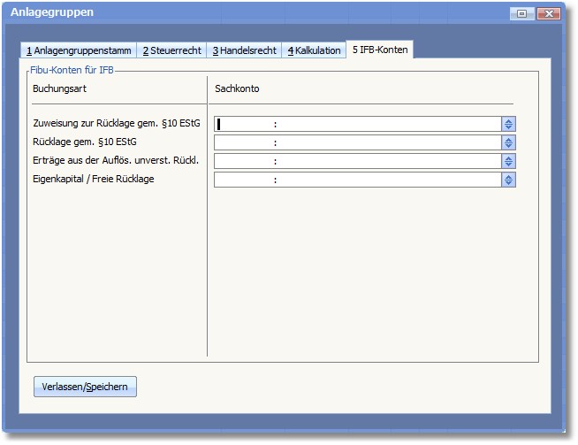 << Hier KLicken um eine Inhaltsübersicht anzuzeigen >> Navigation: Anlagenbuchhaltung > Stammdaten > Anlagegruppen > Die Karteikarte "IFB-Konten" (Österreich) |