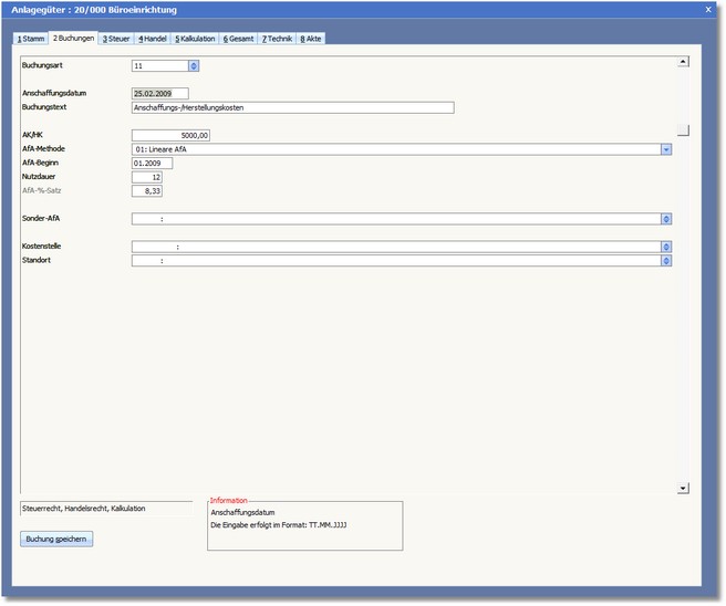 Über diesen Dialog nehmen Sie alle Buchungen vor, die das ausgewählte Wirtschaftsgut betreffen. Zu diesen Buchungen zählen im Einzelnen: