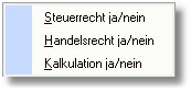abschreiben. Sie können festlegen, für welchen der drei Bereiche eine Buchung gelten soll. Die Voreinstellung ist so festgelegt, dass in jedem der drei Bereiche eine Buchung erfolgt. Über ein Pop-Up- bzw. Auswahlmenü können Sie nun gezielt Bereiche abwählen. Die Tastenkombination [SHIFT]+[F10] öffnet eine Menütafel, die die Bereiche Steuerrecht, Handelsrecht und Kalkulation auflistet.