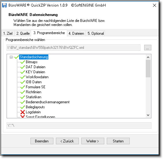 Die Standardsicherung enthält eine Filterung, welche in der Datei „BWQZFC.XML“ festgelegt ist. In dieser Datei können (entsprechende Designkenntnisse vorausgesetzt) auch weitereSicherungsprofile (analog „Standardsicherung“) angelegt werden.