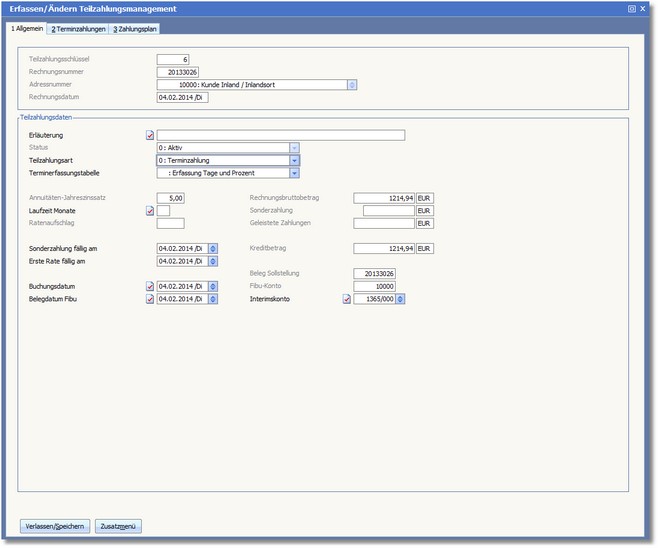 Die Erfassung der Termine erfolgt in Tagen ab Rechnungsdatum und die einzelnen Raten in Prozent vom Kreditbetrag.