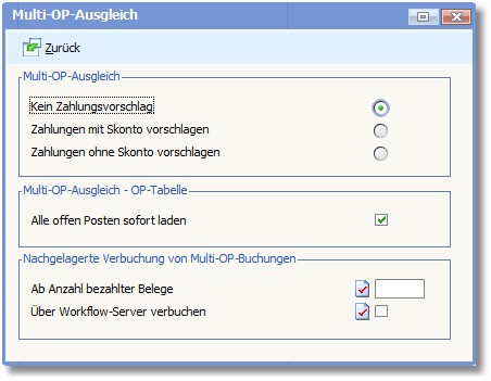 << Hier KLicken um eine Inhaltsübersicht anzuzeigen >> Navigation: Finanzbuchhaltung > Stammdaten > Basisdaten > Basisdaten - Menü "Bearbeiten" > Einstellungen Multi-OP-Ausgleich |