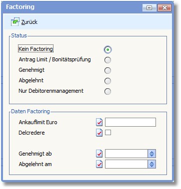 In diesem Bereich wird der Factoring-Status für die Adresse durch Aktivierung des entsprechenden Radiobuttons festgelegt.