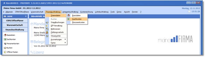 | 1. | Klicken Sie mit der Maus im Hauptmenü auf "Finanzbuchhaltung > Stammdaten > Sachkonten". |